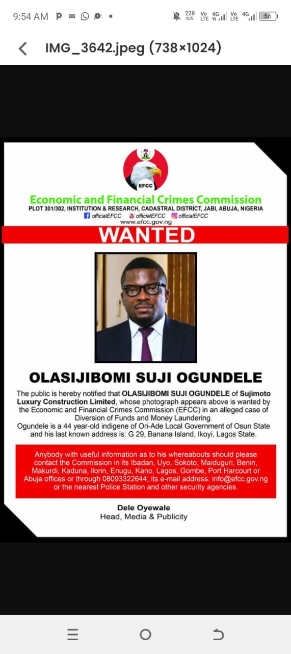 The Economic and Financial Crimes Commission (EFCC) on Friday declared the owner of Sujimoto Luxury Construction Limited, Olasijibomi Suji Ogundele, wanted over alleged diversion of fund.