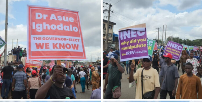 Earlier in a remark, Deputy Director General Asue Ogie Campaign organisation, Reverend Olu Martins who canvassed sacking of INEC electoral officers of Egor, Oredo and ikpoba Okha said they will continue to protest until Dr Asue Ighodalo is declared winner of the election.